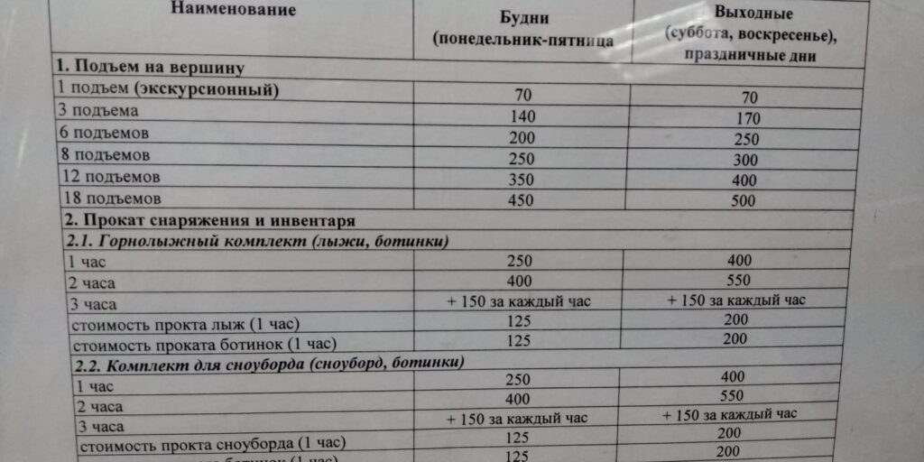 Ценник, как говорится, демократический. Платишь не за время катания, а за количество подъемов. Например, 18 спусков стоит 500 рублей. Их можно катать хоть за 2, хоть за 4 часа с перерывами. Есть тюбинг для малышей, есть трасса для беговых лыж.