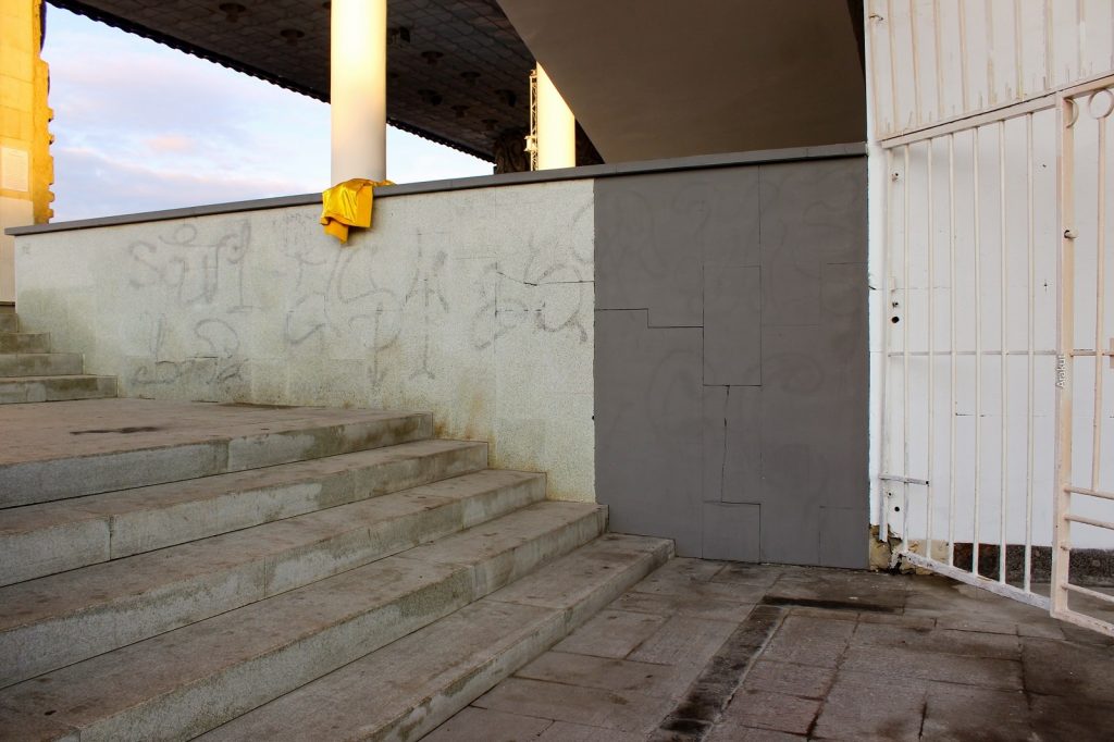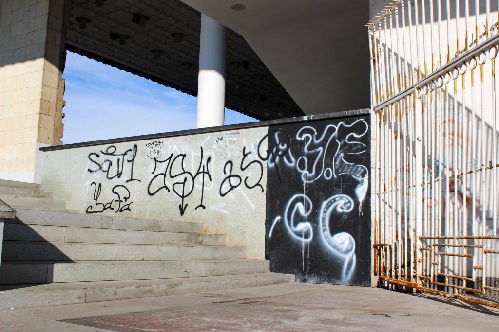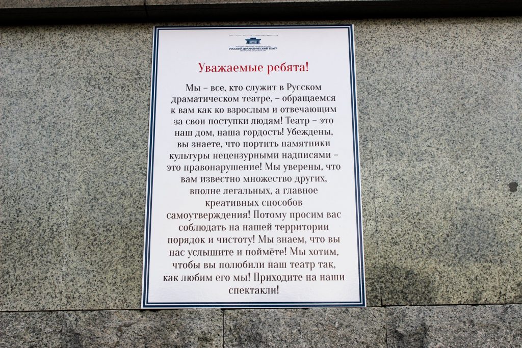 Ну по первой стене у меня вопросов почти нет, кроме цвета. Может стоило сделать ее более… не серой? Я не знаю, позвать Олега Кайбышева, он бы изобразил что-нибудь классное? Или самим скреативить какую-нибудь абстракцию, это же театр все же. Не знаю… А вот надписи оттерли на твердую двойку, АУЕ успешно читается, как и все остальное. Сделали работу на 50% и успокоились, збс.