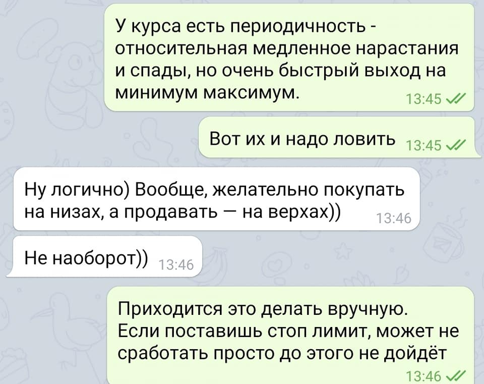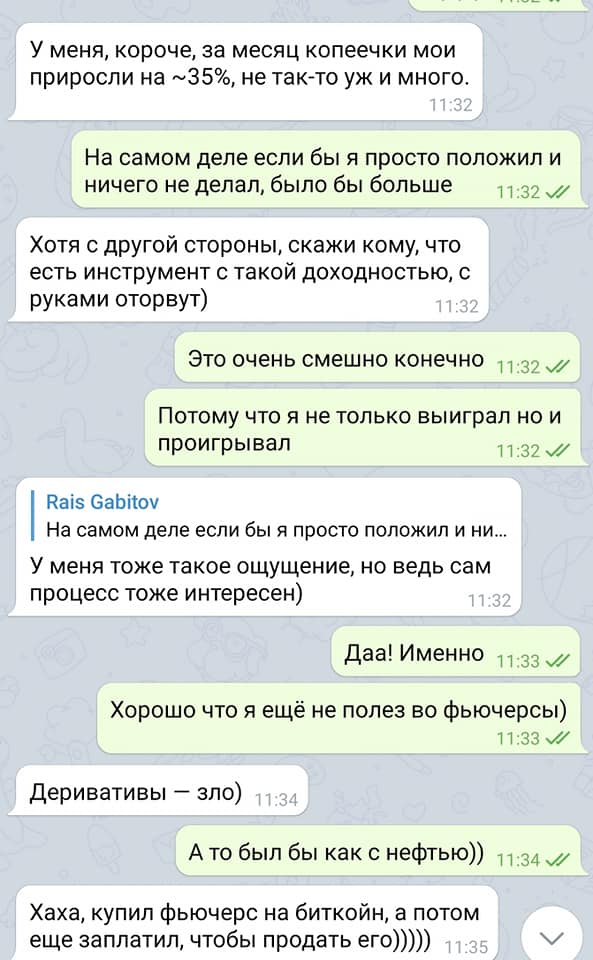 ЗЫ самый крутой момент, это ты когда поставил стоп-лимит на продажу, и пошёл с девушкой в в ресторан. Пока вы болтали и пили вино, за пару часов на бирже заработалось в два раз больше, чем вы проели.