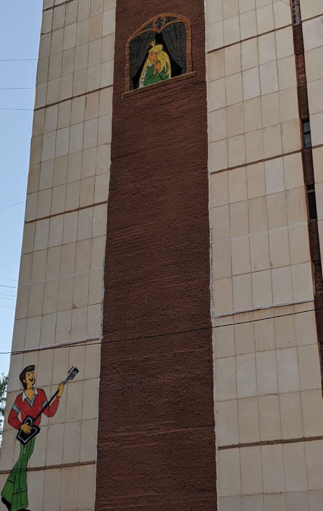 Это хорошо или плохо? Не Бэнкси, конечно. И трубодур отчего-то потемнел. Но лично я, вспомнив свое детство с плоскими советскими мультиками, постоял перед живописью почти в умилении. Понимаю, антисоветчики сейчас закидают этот фасад своей обсценной лексикой, но что предложат взамен? «Уж лучше голый кирпич, чем это!» Не уверен. Любая информация, как учил Штирлиц, она к размышлению, а если ее нет, то остается, действительно, только обсценная лексика