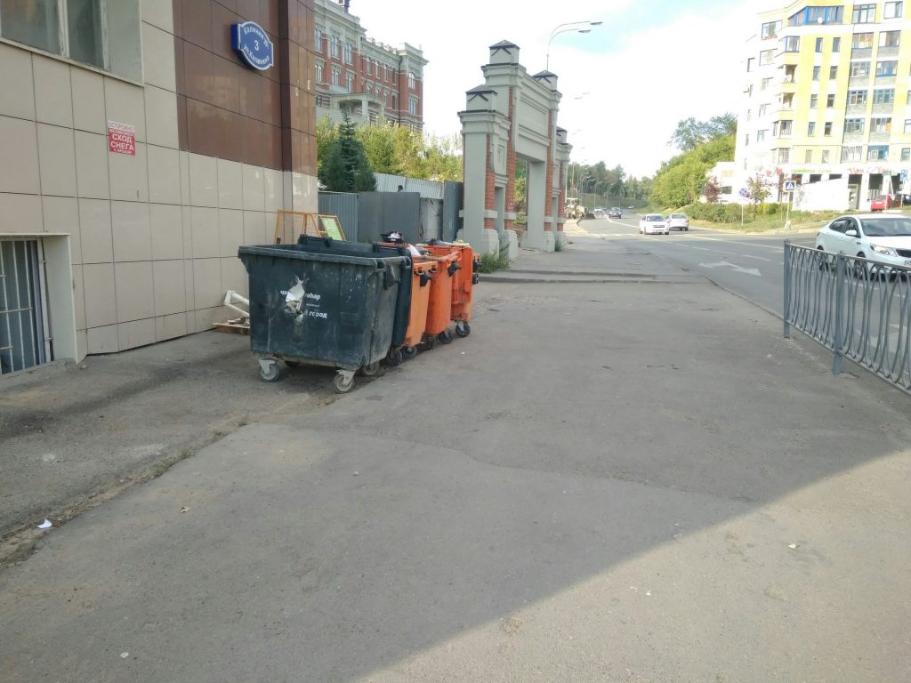 (fotografya 8) Вот это тротуар и на нем расположились мусорные контейнеры. Полные. Странное решение, вонючее решение, уродское. Представьте такие контейнеры где-нибудь на улице Ленина. Получается? Вот и у меня нет.