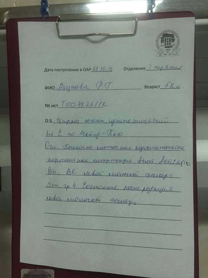 Ей 67 лет. У нее 5 лет назад был рак груди с которым она прекрасно справилась. через 2 года после операции ПЭТ ничего не показал, как и все остальные анализы. Но этим летом она вдруг начала уставать, пропали силы, потом судорги ног, изжога. Начали ходить по врачам и сдавать анализы, тонны анализов, просто километры. И никто, НИКТО ни один диагноз не поставил. Ни онкологи, ни хирурги, ни гастроэнтерологи, ни пульмонологи, ни гематологи. Даже единственный в Уфе лимфолог 30 лет отроду и то ничего не смогла сказать. В конечном счете ее положили в 6-ю больницу БГМУ, где она в терапии пролежала 3 недели на «витаминках» под взором молодой девочки лечащего врача, которая не смогла ответить ни на один вопрос за эти три недели.