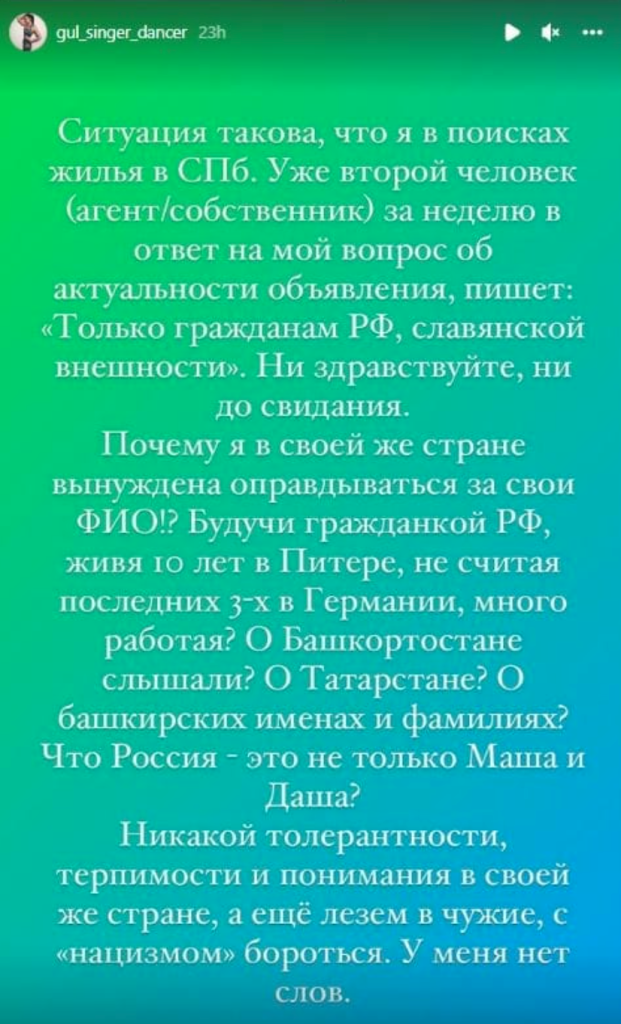 Башкирская певица, хореограф Гульнур Карабулатова на своей личной странице в Instagram рассказала о том, как из-за ее башкирской фамилии она не может снять квартиру в Санкт-Петербурге.