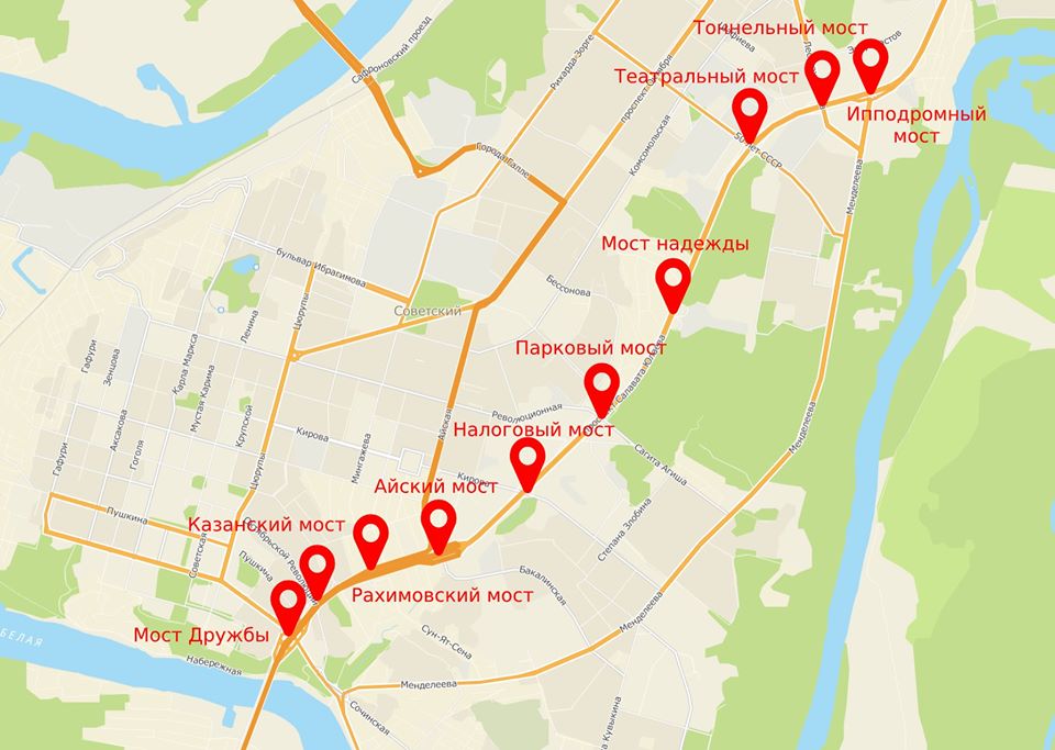 UPD: В комментариях напомнили еще про 2 моста, про которые я изначально забыл. И названия для них было сложно найти. Я предлагаю так. Тот, что по Октябрьской революции — Казанский, потому что хватит с нас революций, а раньше эта улица была Казанской и сейчас она самая историческая в Уфе. А мост рядом со строящейся мечетью — Рахимовский, потому что мечеть там называется Ар-Рахим, да и все таки первый президент республики, при котором проспект собственно и построили. И еще предложили назвать мост рядом с театром Нур — Театральный, а не «Нур» как я сначала думал. Отличная идея.
