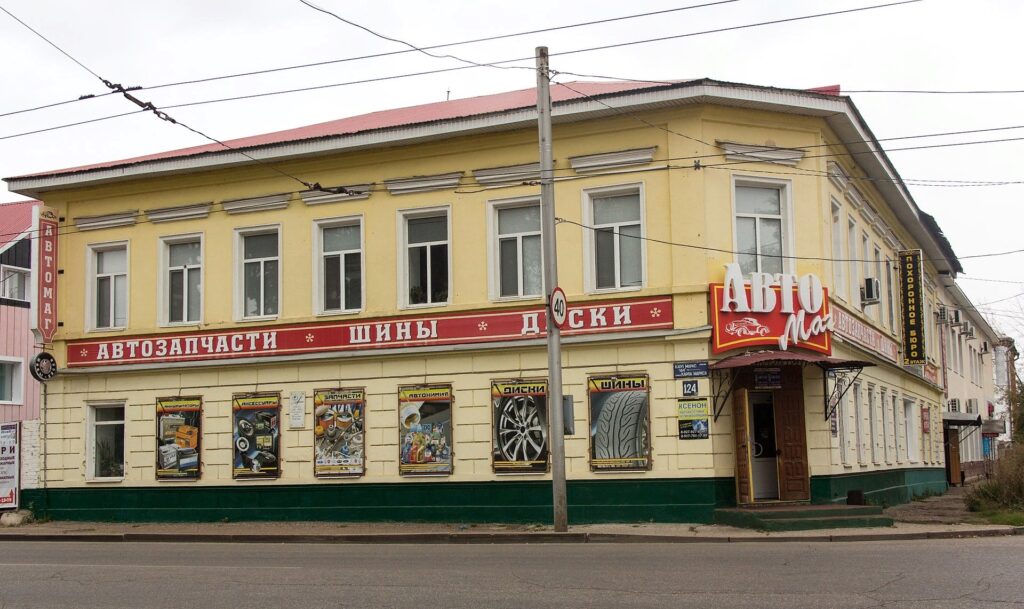 Фото №7. Колониальный магазин Сухоруковой, улица Карла Маркса, 124. Построено до 1898 года купцом 2-й гильдии В.А.Сухоруковым. Второй этаж здания был жилым, на первом размещались колониальный магазин и винная лавка. Почему «колониальный»? Да потому, что в нём продавали товары, доставляемые из европейских колоний и южных областей России: это были фрукты (бананы, апельсины, мандарины, виноград), чай, кофе, халва и прочие экзотические для Стерлитамака сладости. К 1914 году здание перешло по наследству к М.В.Сухоруковой. В марте 1917 года Стерлитамакский ревком конфисковал всё имущество Сухоруковых. В 30-е годы в доме разместилась почта, затем магазин.