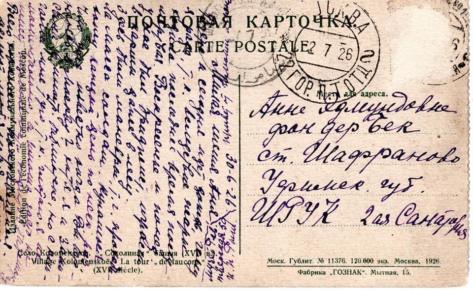 Это присказка. Теперь о находке. Обнаружил открытку из 1926 года, адресованную некой Анне Эдмундовне фон дер Бек. С учётом даты и довольно редкого, согласитесь, сочетания отчества и фамилии предполагаю, что это дочь знаменитого коллекционера. В означенное время она поправляла здоровье в одном из наших кумысных санаториев. Пишет ей, судя по обращению («милая тётя Аня»), вероятно, её племянница.