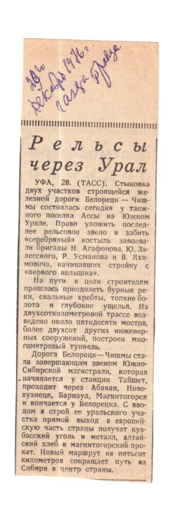 Перебирая домашний архив обнаружила вырезку из газеты «Правда» от 29 декабря 1976г. о строительстве железной дороги Белорецк-Чишмы и о том, насколько стратегически важен этот участок дороги для населения России.