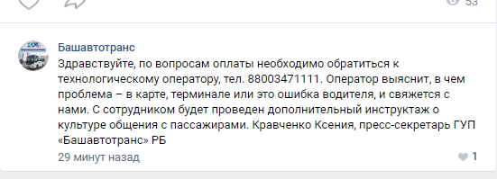 «Здравствуйте, по вопросам оплаты необходимо обратиться к технологическому оператору, тел. 88003471111. Оператор выяснит, в чем проблема – в карте, терминале или это ошибка водителя, и свяжется с нами.»©