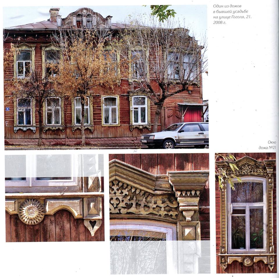 Различные по архитектуре и планировке бревенчатые здания с богатым декоративным убранством стояли и в средней части улицы, некоторые — рядом с каменными домами (особняком лесопромышленника М.А. Лаптева, переданным в 1920-е годы Художественному музею, доходным домом И.И. Талова и другими). Особенно нарядным казался бревенчатый дом с мезонином семьи М.И. Губе (Гоголя, 33).