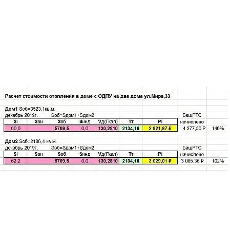 Теперь мы узнали площадь помещений второго дома и можно провести расчет по сумме площадей двух домов как будто это один дом с общей площадью. Расчет показал, что второму дому БашРТС начислили чуть больше положенного 102%, а первому дому 146% — в полтора раза больше, чем должны были начислить по правилам. Более того, этому дому выставили огромную сумму перерасчета за 2019г. Очень возможно, что эта сумма такая же липовая, как и начисление за декабрь. Осталось получить объяснения от БашРТС тому, что произошло.