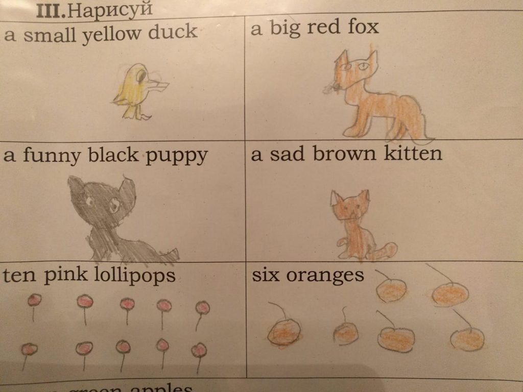 В итоге картина маслом — муж бежит вечером в ближайший ТЦ распечатывать и встречает там еще парочку таких же горемык. В итоге делаем с ребенком два часа окружающий мир и вспоминаем, что не сделан английский. А там — та даааам! Теперь надо нарисовать веселых животных — утенка, лисенка, щенка и котенка. Фигня вопрос, дочка лишь вздохнула и молча нарисовала. Но когда я взглянула на рисунок, у меня случилась истерика. Мордахи этих funny-зверушек точь в точь лица членов моей семьи после выполнения всех домашних заданий, особенно щенок реалистичный получился. Так и живем)
