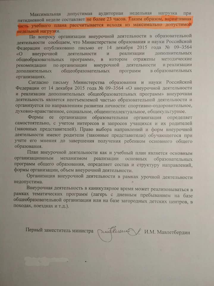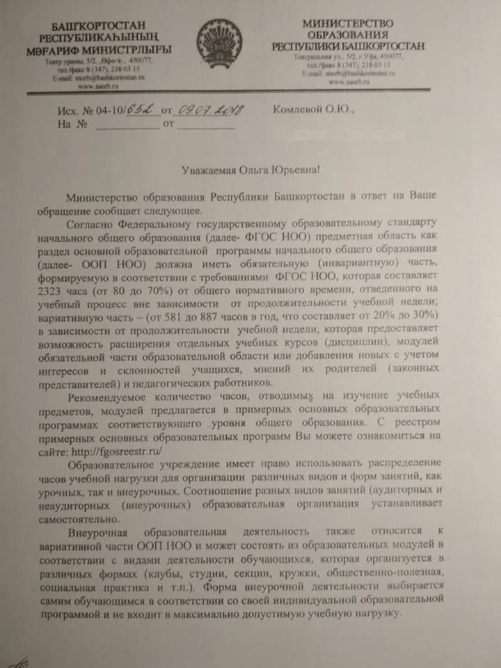 Значит, судя по ответу министерства образования РБ учебный план должен быть пересмотрен и школа должна нам найти еще 3,5 часа и предоставить выбор предметов.