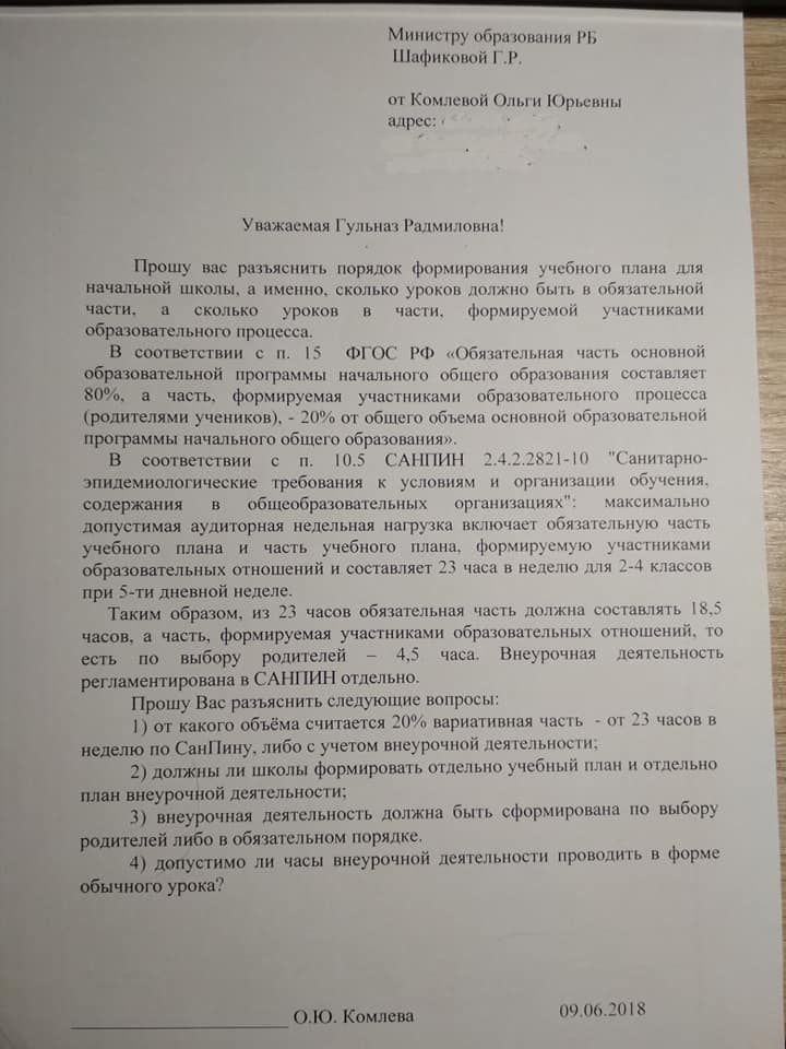 Но вот что интересно- оказывается, что в неделю у нас должно быть от 4,5 до 10 уроков (в зависимости от класса) предметов по выбору родителей. То есть мы должны писать заявление о выборе предмета не только башкирского, но и других, например математики, иностранного или физкультуры.