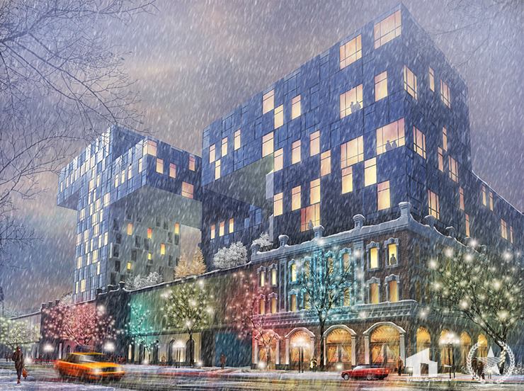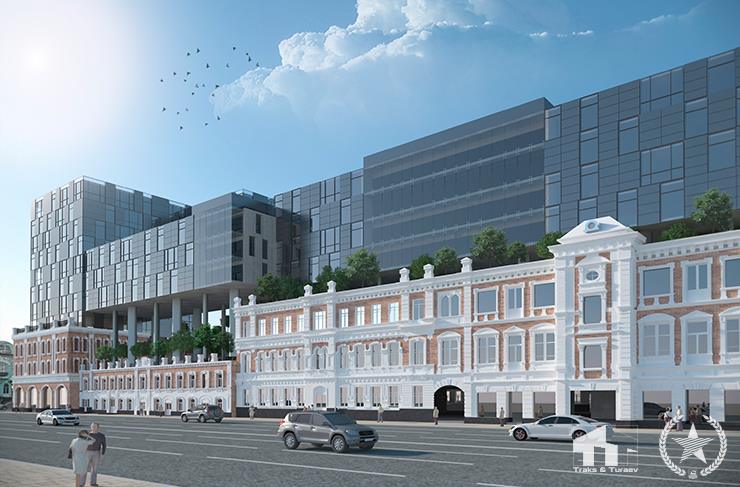 Первые этажи по ул. К.Маркса будут занимать рестораны, 2-3 – офисные помещения. Кровля исторических зданий эксплуатируемая, на ней расположены прогулочные зоны, площадки для тихого отдыха и детские площадки.