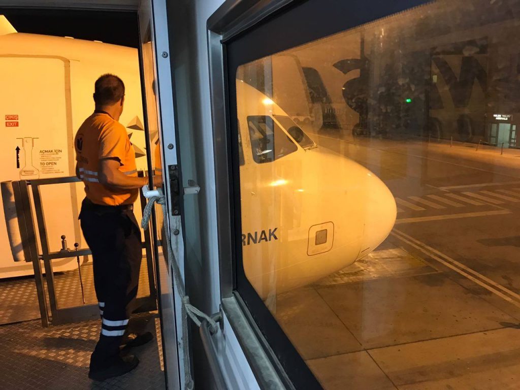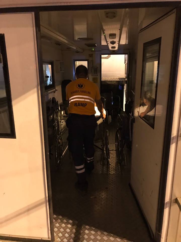 В Стамбуле мы выходили из самолета через рукав. Там нас тоже ждал сотрудник аэропорта, но уже с автоматизированным креслом (электромобилем по сути). Отвез нас, на борт тоже первыми закатили.