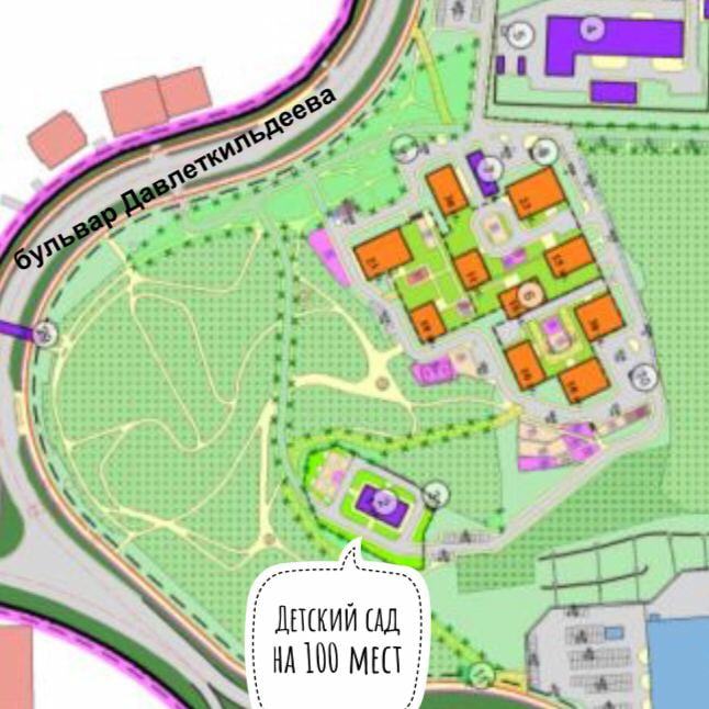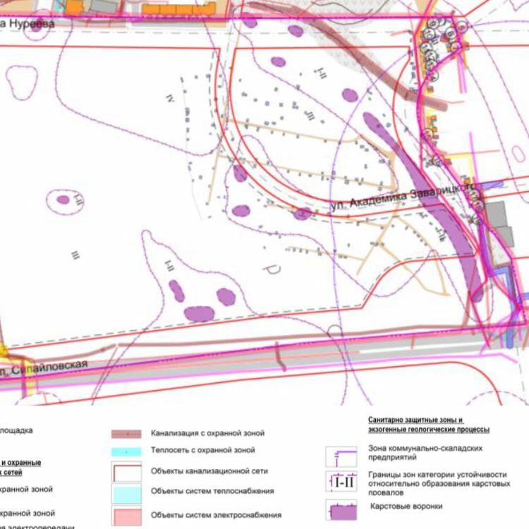 Следующее: схема санитарно-эпидемиологического зонирования, «зоны крутых склонов и оврагов» выделены коричневым контуром. Интересно, сколько метров от будущего детского сада на 100 мест, предусмотренного проектом планировок, до оврага — меньше 100?Место предполагаемого садика на следующей схеме.