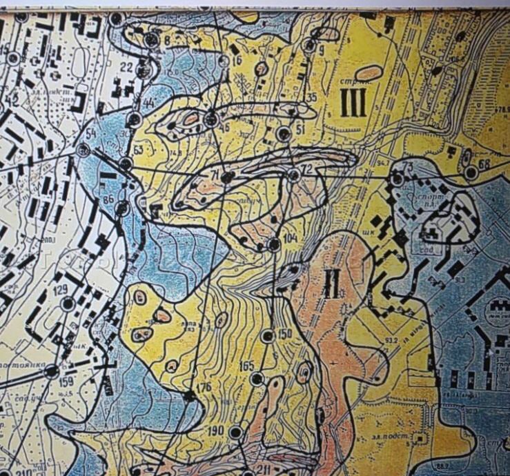 А теперь взглянем на карту карстовых воронок города Уфы ориентировочно 1970-х годов. Персиковый цвет- 2 зона карста.