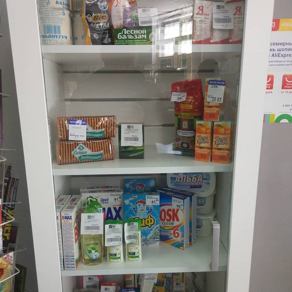 Почта. Вообще в последнее время радует, претензий особых нет, лично у меня. Есть и удобное приложение для отслеживания посылок, и в отделении всё автоматом — не нужно заполнять бумажки и показывать паспорт при получении отправлений, очередей значительно меньше стало. Но вот для чего? Вернее для кого? Для кого эти продукты на полках. Нет я понимаю если это отделение в деревне или там в селе, где магазин, библиотека и бар-ресторан это всё почта. Но блин в городе то нахрена?