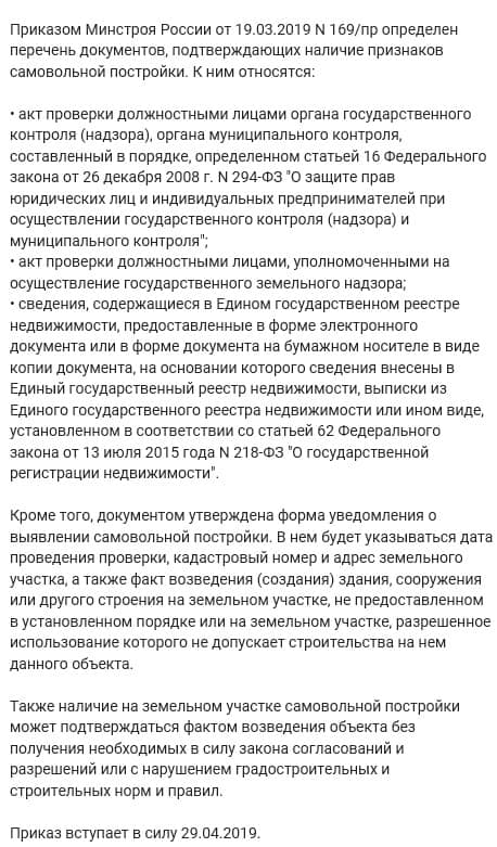 Похоже, что с 29 апреля 2019 года начнутся проверки самовольных построек. Приказ Минстроя вышел. А в Московской области уже начали составлять Акты по выявлению незарегистрированных объектов недвижимости. Я все думала, когда же они начнут заставлять людей регистрировать свои домики.