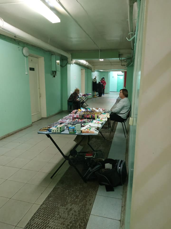 По прописке это поликлиника 2. Во-первых, меня удивили эти женщины возле регистратуры, что на фото 1. К дорогущим аптекам и магазинчикам при больницах я привыкла ещё в Уфе. Но продавать помаду и браслеты. Это вообще законно? Или, убрав в подвал регистратуру и эту фигню, типа никто не видит? Или это сделано с любовью к бабушкам, удобно же – всё в одном месте. Шик и блеск.