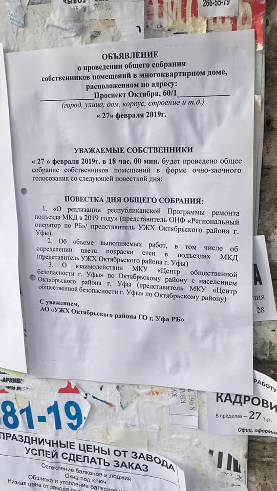 Получив в прошлый и текущий понедельники разнос от главы республики по поводу ремонта подъездов, и продлив срок «согласований» с жителями вопросов проведения этих ремонтов и проведения собраний (которые на 18 февраля, т.е. на дату прошлой оперативки по Уфе уже 146% были проведены), для сбора дополнительных красивых фотографий, УЖХ города выборочно решили вновь провести собрания.