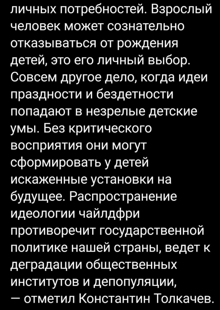 Поспорю с башкирскими депутатами, которые решили выступить против распространения идеологии чайлдфри среди подростков. Подростки просто должны быть чайлдфри. «Не торопись рожать. Сначала выучись, встань на ноги, семью заведи, в конце концов!». Разве не это внушают им родители и вообще все вокруг? Я вот в детстве была очень даже чайлдфри. И даже в 27 была ею. А в 30 перестала и родила первого ребёнка, и это было естественно и осознанно. И стала супермамочкой, потому что с детьми мне в кайф.Зачем мешать детям проходить все стадии нормального созревания. Не хотеть детей в подростковом возрасте и в ранней юности — это нормально, это здоровое явление, его надо пережить и дозреть до желания иметь детей. И да, гедонизм в молодости — это тоже нормально и правильно. Беззаботно путешествовать, тусоваться — естественный этап развития человека.