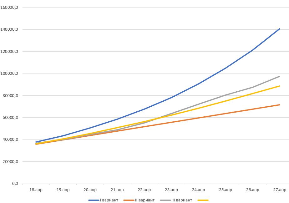 Республика Башкортостан и карантин. С нескольким запозданием публикую прогноз по Башкирии (рис. 2). Это прогноз делали 16 апреля. Мы прогнозировали на 18 апреля 270 заболевших, а сегодня их 252 по официальной статистике. Можете сами отслеживать на сколько наш прогноз будет отличаться.