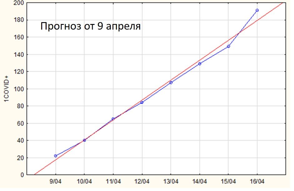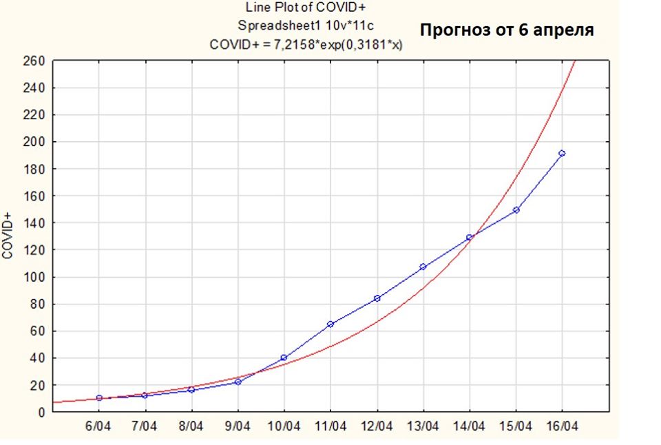 Статистика и карантин. Простой пример для тех, кто не верит в карантин. Смотрите рисунок 3. Прогноз от 6 апреля по РБ – ожидается экспоненциальный рост (кривая «летит» вверх). Экспоненциальный рост означает что 1 больной заражает больше 1 больного. Республиканскими властями вводится карантин (рис. 4) – кривая уплощается и становится линейной. Линейная кривая означает что 1 больной заражает только 1 здорового.