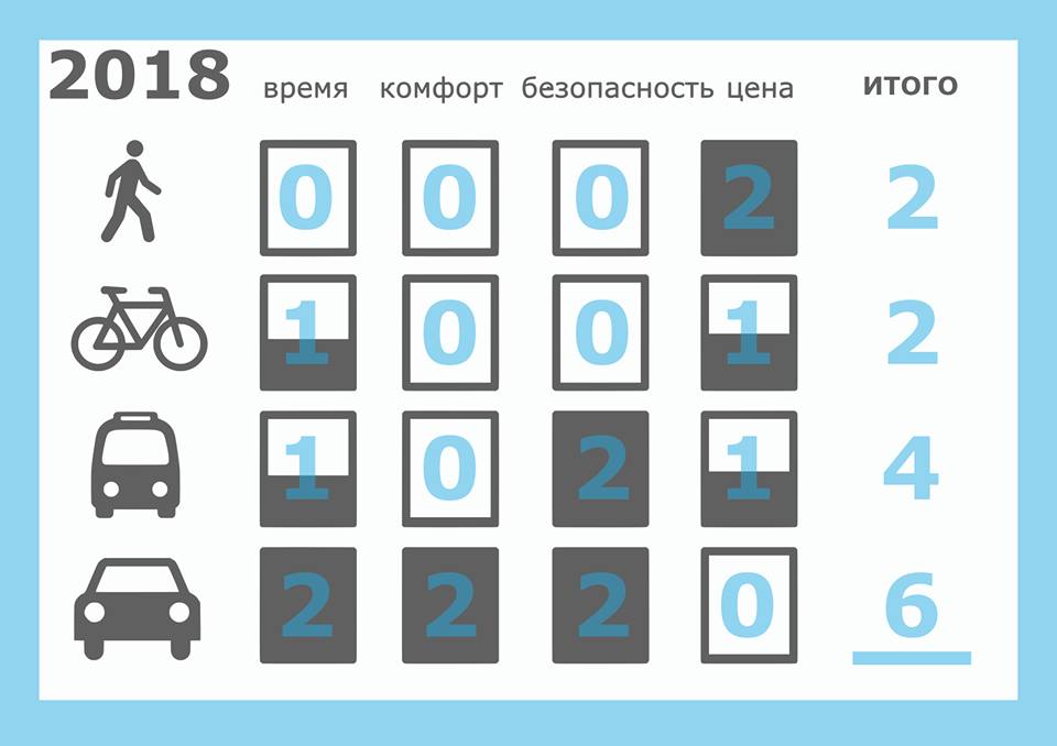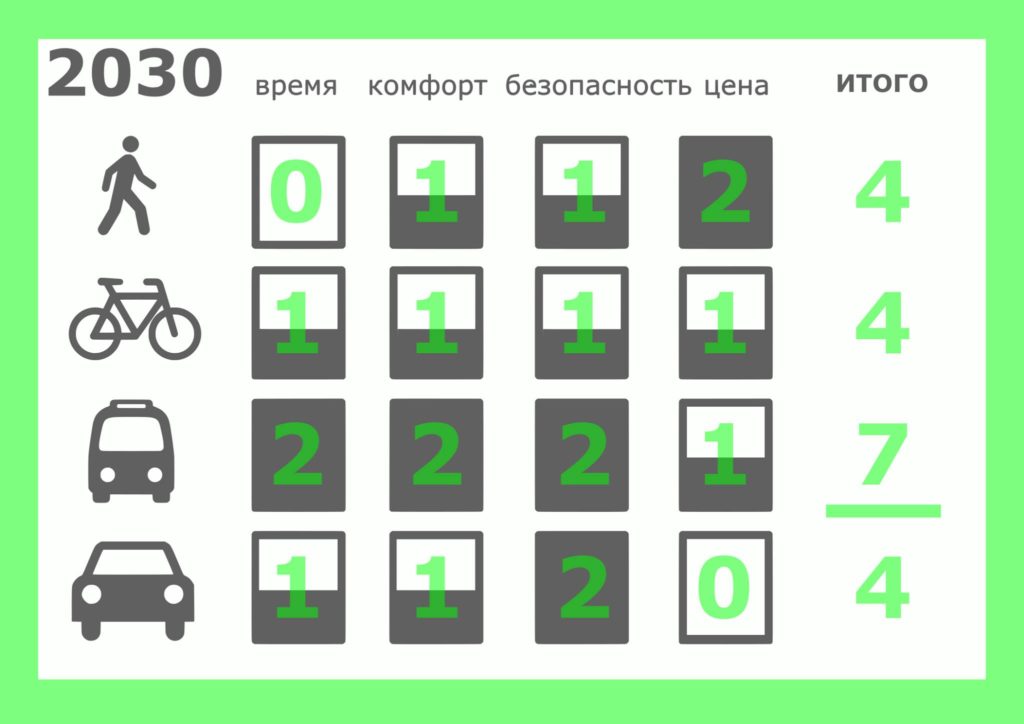 Пешком идти медленнее всего, а в отсутствии качественных пешеходных путей это небезопасно и некомфортно. Поэтому по первым трем критериям пешеходный транспорт получает по нулю баллов. Зато это бесплатно — тут 2 балла. Велосипед едет быстрее, но по комфорту и рискам также нечем хвастаться, пока в городе нет велодорожек. Цена поездки же дает 1 балл, так как велосипед стоит денег, но один раз, а эксплуатация почти бесплатна. Общественный транспорт по времени поездок близок к велосипеду, так как нужно дойти до остановки и потом до цели, а еще ждать свой автобус (трамвай), стоять в пробках, на остановках и часто ехать не прямой дорогой, а кругами. По комфорту в нынешнем состоянии ОТ также в проигрыше (0 баллов), а вот безопасность вполне достойная (2 балла), хотя иногда это вызывает сомнения. Цена поездки невысока, но она все таки есть, так что 1 балл. Автомобиль сейчас — это быстро, комфортно и достаточно безопасно. Тут все судьи 2 балла. С ценой сложнее, считать надо не только бензин, а совокупную стоимость эксплуатации авто от покупки до продажи. Есть много подсчетов, но консенсус такой — это очень дорого. Порядка 12-15 рублей на километр пробега без учета затрат личного времени владельца и в случаях без автокредита. То есть это дороже такси и каршеринга, но обычно автовладельцы не считают всего, а только ГСМ, так что часто принимают неверные решения.