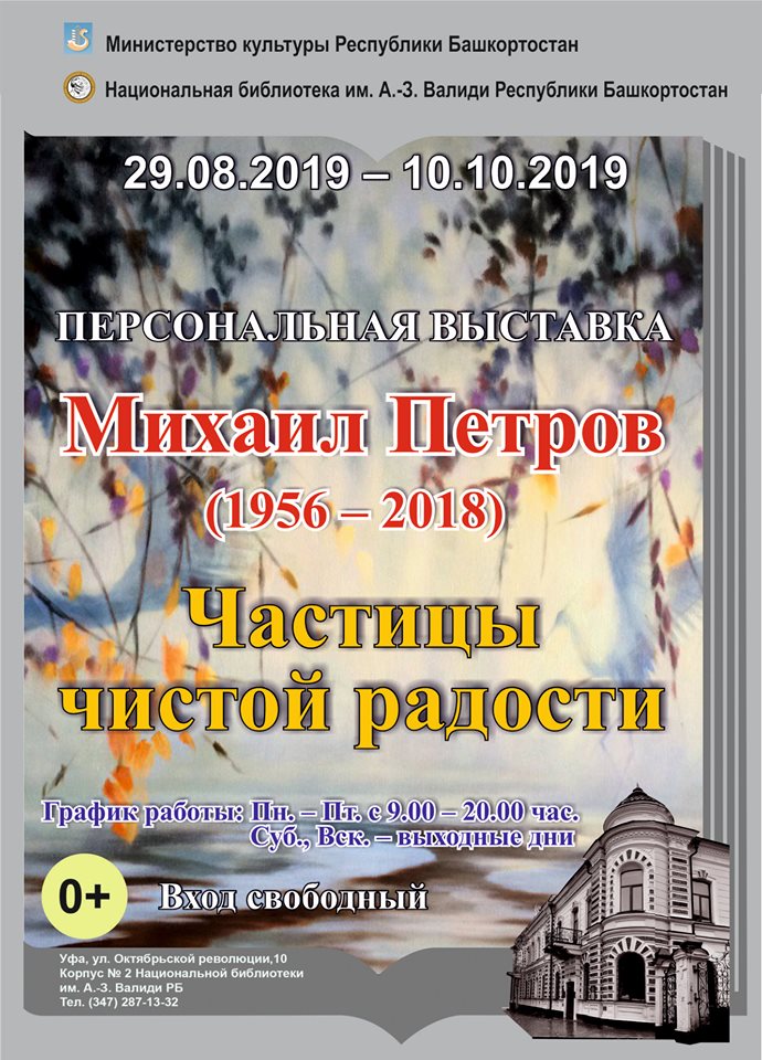 В Большом выставочном зале библиотеки представлена выставка памяти талантливого уфимского художника Михаила Петрова «Частицы чистой радости». Яркий самобытный мастер много писал для детей и взрослых, оформлял детские книги. Своим добрым и светлым творчеством художник утверждал, что сказка, волшебство – в самой реальности, а частицы радости — всегда вокруг нас, просто мы их часто не замечаем…