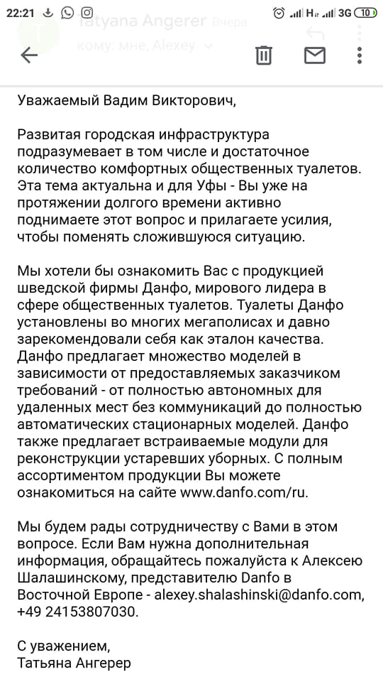 Господа дамы из Швеции, возможно по протекции Лайко, а может при помощи Гугла, прислали мне на почту info@ufacity.me предложение по модным общественным туалетам для Уфы.