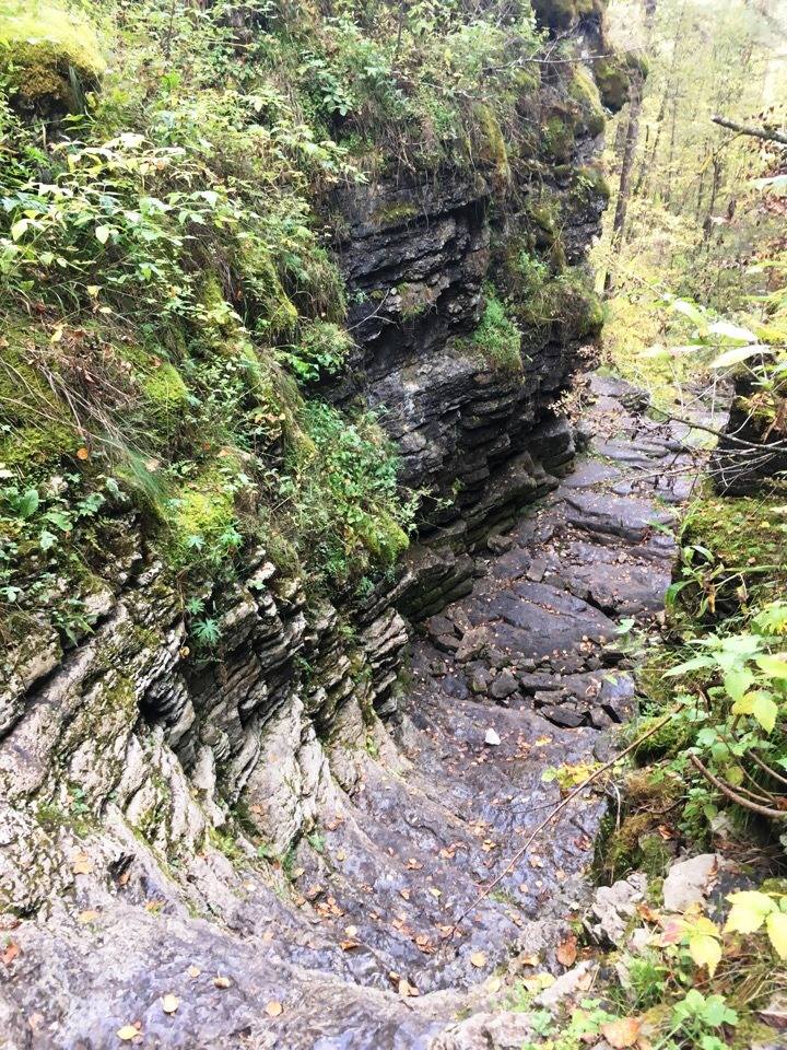 Сухие водопады представляют собой русло реки, высохшей более тысячи лет назад. Красоту здесь образует ступенчатый каскад, который выглядит как гигантская каменная лестница с многочисленными ступенями, высота которых около полуметра. Подниматься и спускаться по ним было нетрудно. Но нужно постоянно помнить, что они влажные и скользкие. Прохладно как в погребе. Летом и осенью воды в здесь нет, и только весной сухие водопады оживают.