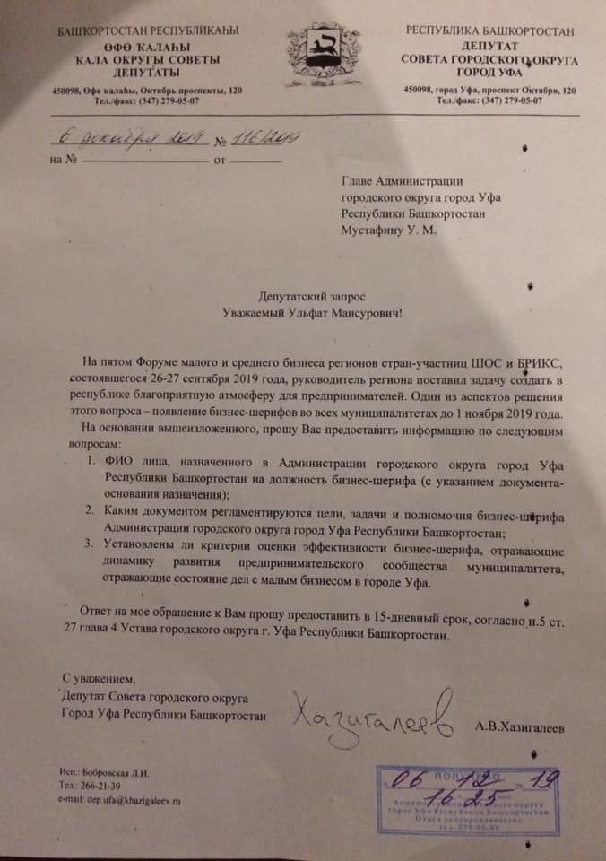 Руководитель региона поставил задачу создать в республике благоприятную атмосферу для предпринимателей. Была поставлена цель до 2024 года увеличить количество лиц, которые заняты в предпринимательской деятельности. Одним из способов помочь предпринимателю стало появление так называемых бизнес-шерифов. Должность с заимствованным названием ввели во всех муниципалитетах республики, фактически это будет заместитель мэра, в обязанности которого входит только работа с предпринимателями и защита их интересов.