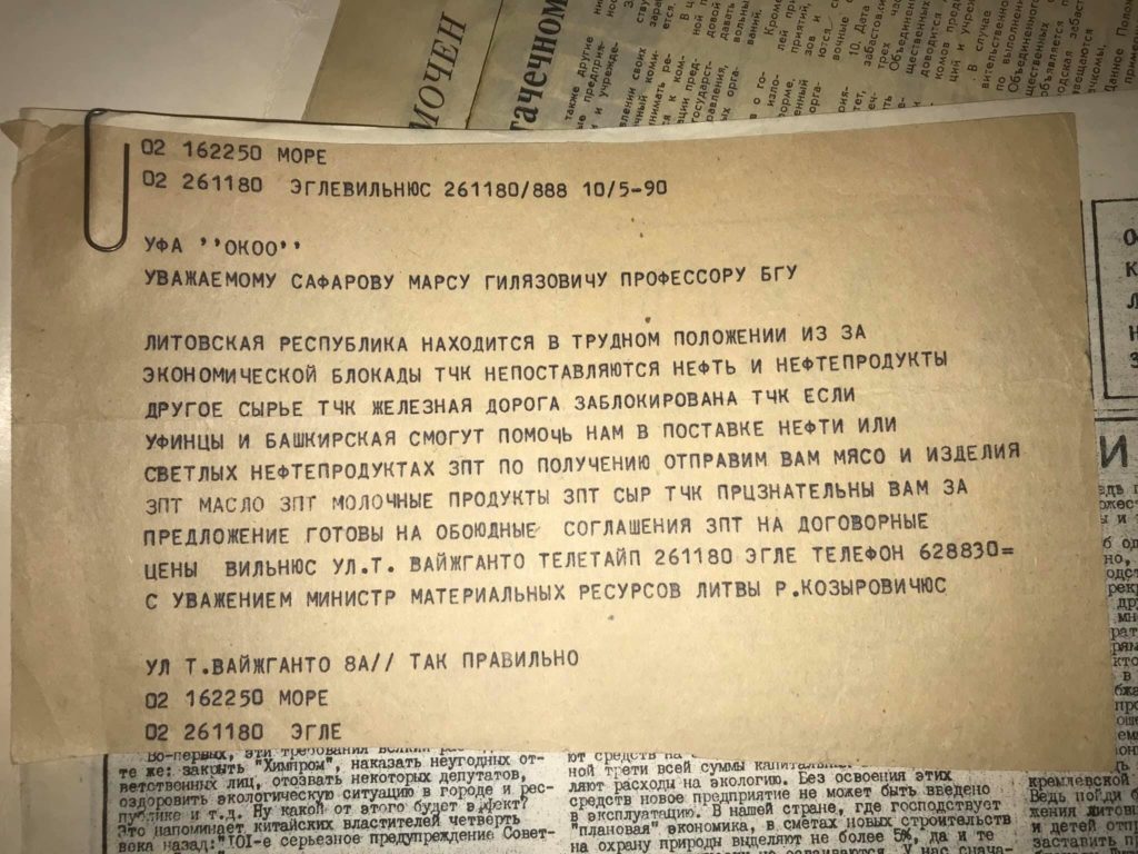 Продолжаю изучать архивные документы уважаемого профессора Марса Сафарова. Перед вами телеграмма министра правительства ещё Литовской ССР с просьбой отправить из Башкирской АССР нефтепродуктов в обмен на мясо, масло и сыр. Май 1990…