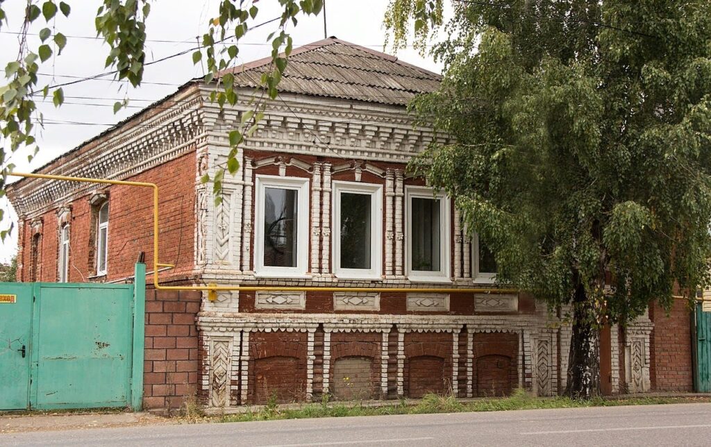 Фотография №1. Дом М. Моченева (Дом Водопьянова), улица К.Маркса, 83. Это дом с ажурными резными наличниками и карнизами был построен в 1912 году купцом Константином Дмитриевичем Моченевым на месте сгоревшего во время пожара 1908 года дома его отца Дмитрия Фёдоровича. По сведениям местных краеведов и историков, К.Д.Моченев был известен в дореволюционном Стерлитамаке как крупный оптовик по закупке скота. Имел собственное колбасное производство, которое размещалось в этом же дворе.