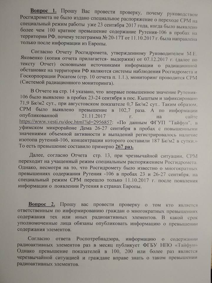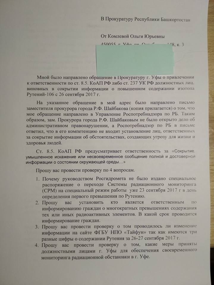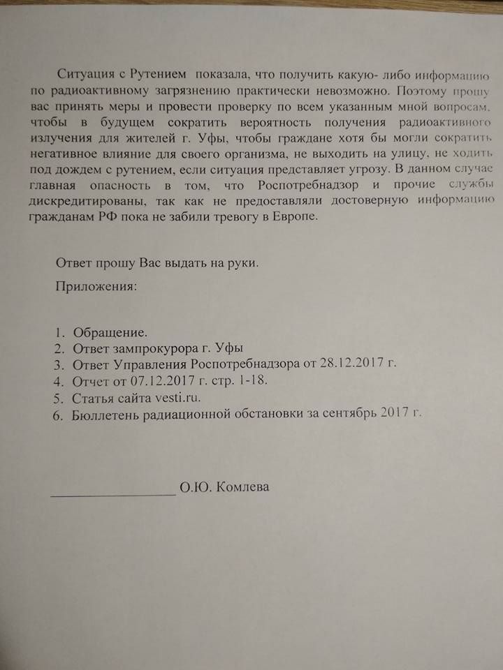 И мне совсем не ясно с нормами и безопасностью рутения. Тут везде пишут, что то что выпало более чем в 200 раз меньше годовой нормы. Но все измерения указаны в Бк/ на м2 в сут, а в Санпине указана норма в мБк/м3. Это совершенно разные величины. Поскольку по рутению они уже много раз были «Господа соврамши», пытаюсь сама в этом разобраться. Я не физик — ядерщик вот и прошу прокуратуру разобраться во всем этом. Ведь у прокуроров тоже семьи в Уфе живут.