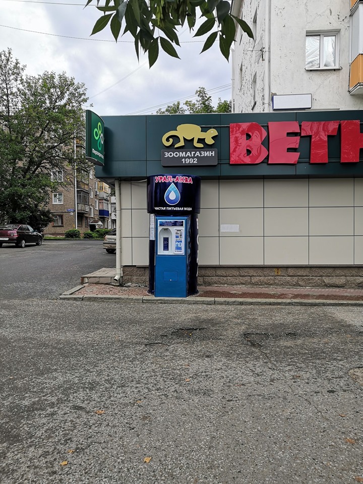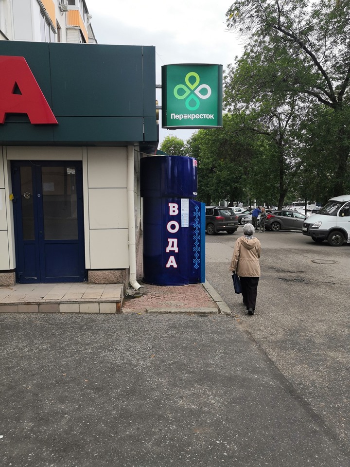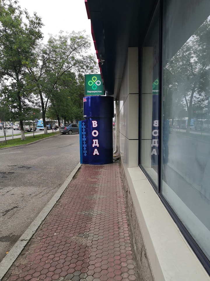 Первая позитивная новость рядом с моим любимым куриным магазином — умные люди, понимающие как делать правильно и разумно, поставили автомат по продаже воды прямо на дорожке для пешеходов. У такого решения сразу несколько плюсов: