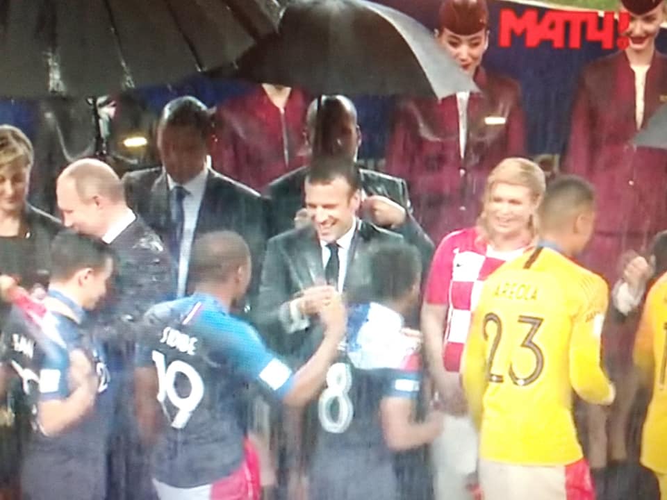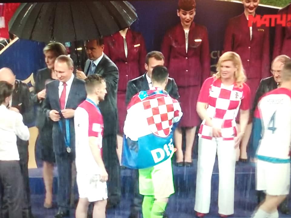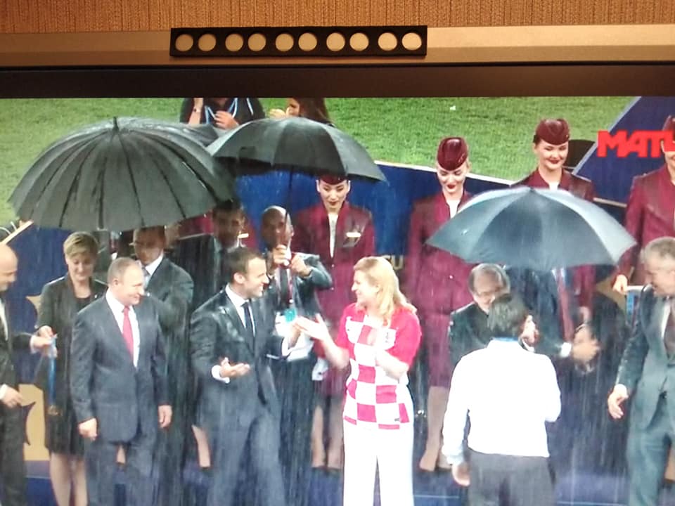Путин минут десять никому не давал свой зонт. И только потом принесли зонты франц.президенту и кому-то там. Хорватская президентша так и мокла минут 15. Неужели никто не предполагал ливень? Обыскивали каждый зонт? Но. Было романтично. Слезы, дождь…