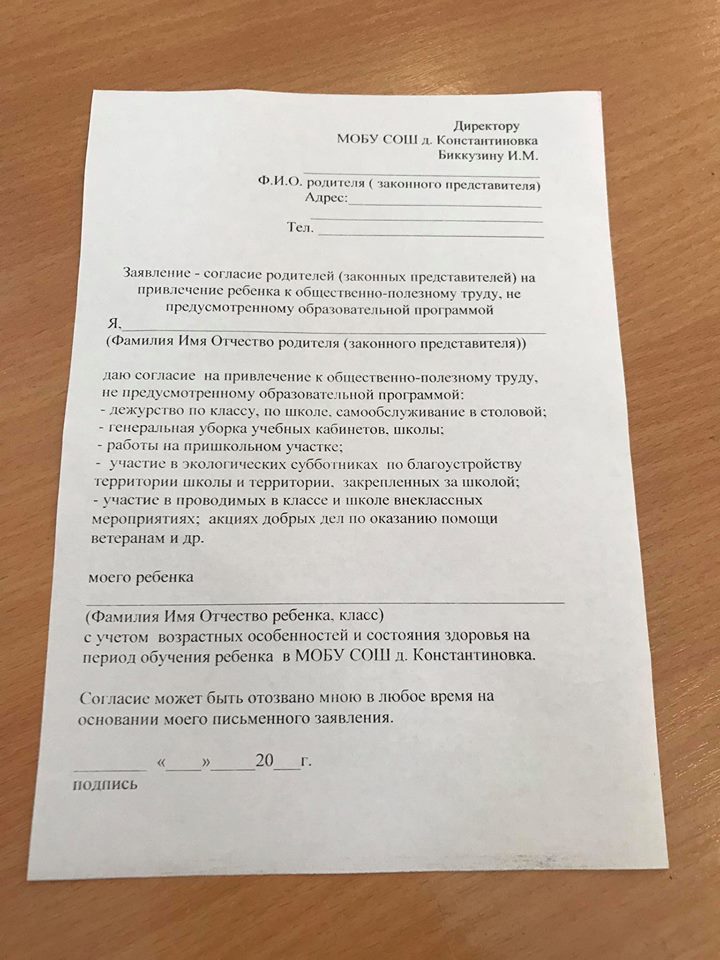 7 октября 2018 в школе МОБУ СОШ д. Константиновка во всех классах раздавали бланки “заявления📝 – согласия родителей на привлечение к общественно – полезному труду, не предусмотренному образовательной программой” (фото прикладываю). Данные заявления надо было заполнить и передать на следующей день классному руководителю.