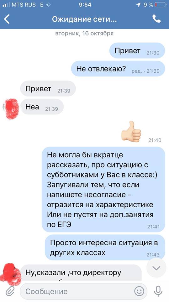 10 октября 2018 г. она пришла в школу и начала беседу с классным руководителем 10 класса, Садыковой Людмилой Олеговной, про незаконные принуждения учащихся к субботникам, а также задала ей вопрос: почему заставляют подписывать заявления задним числом (31 августа 2018 г).