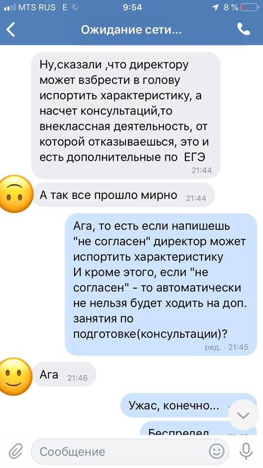 На что она ей пояснила, что все это придумала не она, и поэтому ответить вот так сразу не может. Также она сообщила, что она всего лишь “исполнитель” и делает то, что сообщило ей руководство(Мухаметшина). Мама попросила её дать письменные объяснения того, почему меня, а также остальных учеников, чьи родители не дали согласие на привлечение их к общественно – полезному труду, не пускают на дополнительные занятия(консультации) по подготовке к ЕГЭ/ОГЭ, также мама отметила, что дополнительные занятия ни коем образом не относятся и не могут быть отнесены к общественно-полезному труду и поэтому заявление на общественно-полезный труд никак не может влиять на допуск ученика к консультациям по подготовке к ЕГЭ/ОГЭ, на что учительница согласилась, и сказала, что подготовит письменные объяснения (по настоящее время письменных объяснений не поступало).