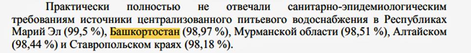 Из доклада: «Практически полностью не отвечали санитарно-эпидемиологическим требованиям источники централизованного питьевого водоснабжения в Республиках Марий Эл (99,5 %), Башкортостан (98,97 %)…». (стр.28) (По сравнению с 16-м годом мало что изменилось).