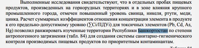«Выполненные исследования свидетельствуют, что в отдельных пробах пищевых продуктов, произведенных на горнорудных территориях и в зоне влияния крупного промышленного города, отмечен повышенный уровень свинца, никеля, ртути, меди, цинка. Расчет суммарных коэффициентов отношения концентрации элемента в продукте к его предельно-допустимому уровню (∑Ci/ПДУi) для токсичных элементов (Pb, Cd, As, Hg) позволил ранжировать изученные территории Республики Башкортостан по степени антропогенного загрязнения (табл. 84) для создания системы санитарно-гигиенического контроля производимых пищевых продуктов по приоритетным контаминантам». (стр 169)