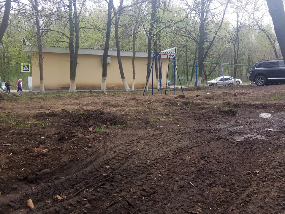 Детские качели, достаточно новые, поставлены в грязь, которую колесами развозят автовладельцы.