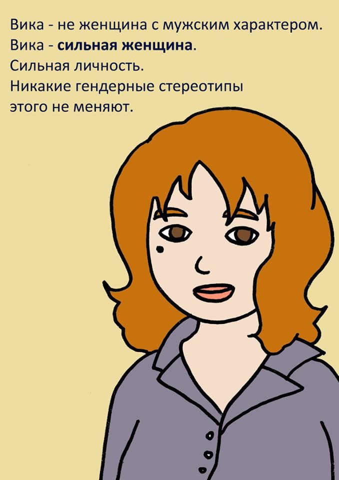 Если начать вдумываться в это, то понимаешь, насколько подобное сравнение принижает всех остальных женщин и героиню публикации, которая характером, конечно, обладает, но не «мужским», а просто сильным, с лидерскими качествами. И такой характер есть у части женщин и у части мужчин. Но этот штамп просто неистребим! Хотя в обратную сторону он, разумеется, не действует. Никогда мужчину с чертами, которые по традиции приписываются женщинам, с женщиной не сравнят и не скажут, что он родился с прекрасным, мягким, уступчивым женским характером. Иначе он не смог бы никому не противостоять и жить тихо-мирно до конца своих дней)
