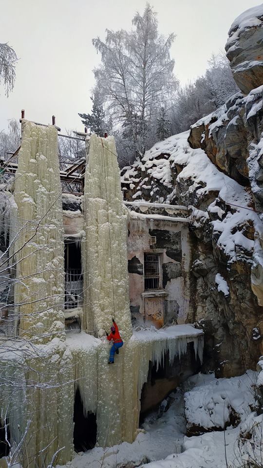 Скалолазы покоряют замёрзший водопад у старой плотины