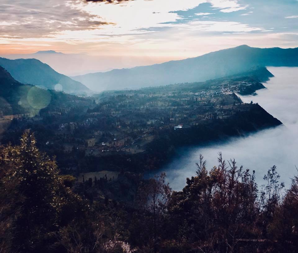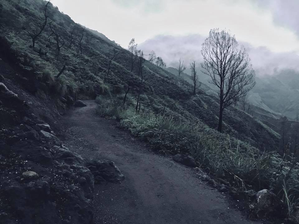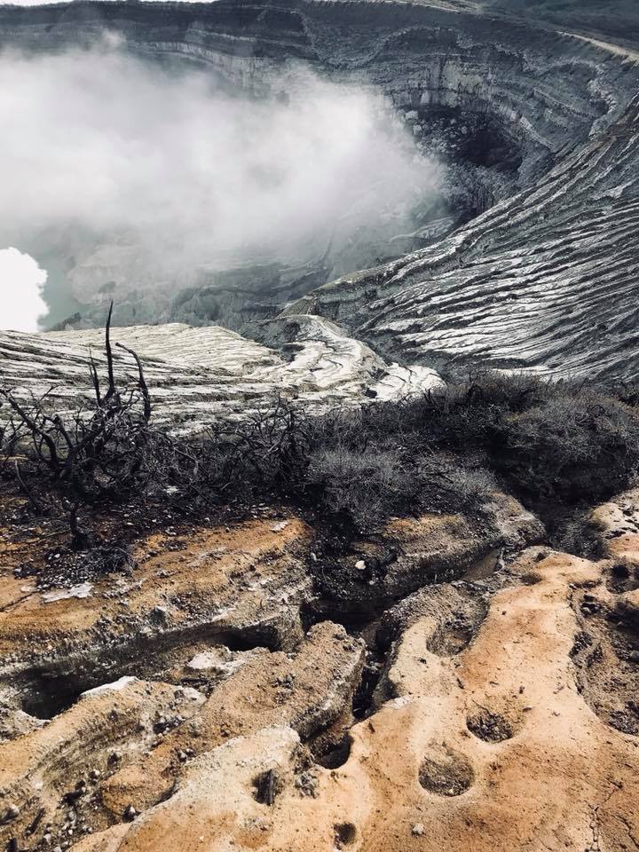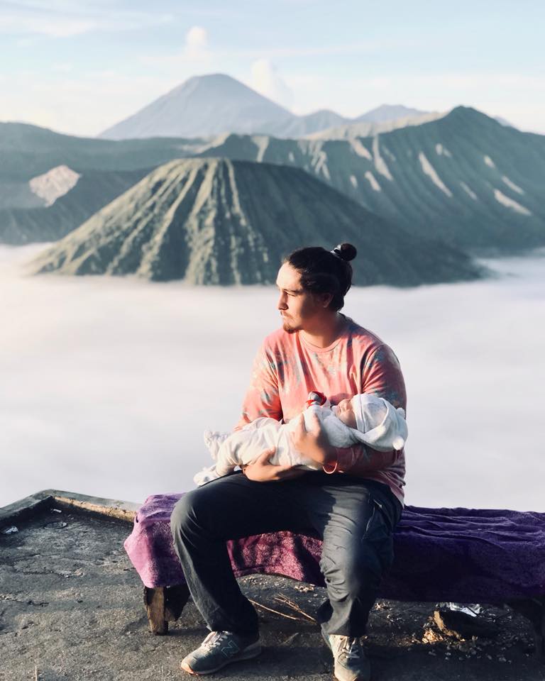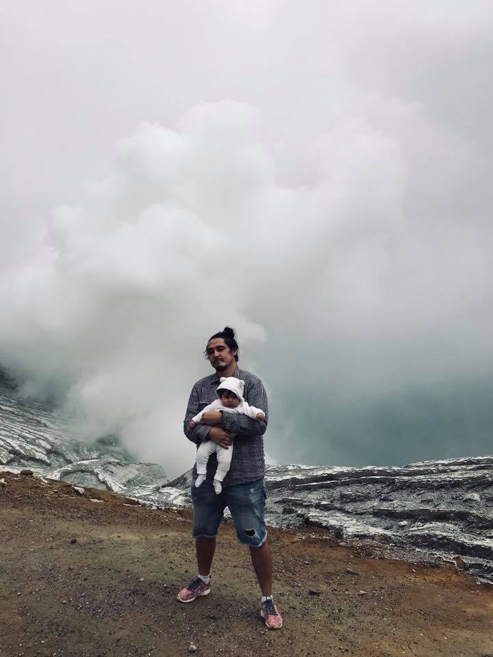 Изначально идеи поднимать ребёнка не было, ведь это опасно и там люди как-бы умирают, но вот так получилось. Это было в начале марта 2018 года. Выехали мы к подножью глубоко ночью, часов в 2-3, чтобы успеть к рассвету, ведь в это время он виден лучше всего. Машина оставляла желать лучшего, что иногда в гору мне приходилось выходить с сыном на руках и толкать его. Добравшись до места начала подъёма к вулкану, была договоренность взбираться по очереди. Так как прибыли немного позже всей основной толпы туристов, все проверяльщики уже спали, билет мне не пробили и прошёл бесплатно. Через часа 2 уже был у самого жерла, самое опасное в этих местах это пары газа и дыма от которого можно задохнуться и умереть, поэтому многие ходят сюда с масками. Количества критического дыма зависит от ветра, а его направление никогда не угадаешь и в рюкзаке на этот случай лежал противогаз. В моём случае погода была ясная и хорошая,что он мне не понадобился. Почти бегом поднялся,полазил и спустился, на всё ушло около 5 часов, кроссовки оказались такие удобные, что готов был ещё и на второй подъём. Исследовав там всё вокруг, решил,что уровень опасности минимален.Погода отличная и солнечная,ветра нет. Предложил Валерии подниматься втроём, вместе и веселее, и беспокойства меньше. Предварительно договоришись, что если появится хоть какой-то намёк на вредные выбросы я пойду спускаться. На пол дороги мышцы ног забились и нужно было иногда останавливаться, чтобы передохнуть, но Самрау в слинге был категорически против этого, сразу начинал реветь, пытаться выбраться, в движении же успокаивался мгновенно, порой даже засыпал. Поднявшись до вершины кратера сын захотел естественно есть. Как же всё таки удобно путешествовать с грудным ребенком, еда у матери всегда с собой. Через полчаса повеяло легким ветерком и запахом тухлых вареных яиц, это был явно запах серы с жерла. Пора спускаться! Отдав противогаз жене, которая тоже очень хотела побывать в жерле вулкана у озера, мы с сыном пошли вниз. А пройдя метров 500 начался такой сильный дождь, что даже зонтик, который взяли на всякий случай, протекал и мне капал на лицо,чем меня нервировал. В этот момент проснулся ещё малой и явно не хотел спокойно висеть на руке. Спустя 2 км, хлюпая заполненными водой кроссовками по грязной тропе, еле удержавая сына и зонт от ветра, добрался наконец до местного кафе, где была крыша, где можно спрятаться от этого гребанного ливня и посидеть, чего давно просили мои мышцы рук и ног. Было хорошо, но всё больше волновался за свою женщину, которая без дождевика и зонта, насквозь мокрая, одна (все рабочие и туристы давно ушли) и вся в дыму от которого практически ничего не видно, а если еще подниматься обратно из жерла вверх будут огромные потоки воды, что трудно идти, не видно будет тропы. Если уйти с протоптанной тропы можно и навернуться от неустойчивых камней. А если фильтр в маске не поменяли и она надышиться? Сидел размышлял, беспокоился, уже составлял план действий, накручивал себе. Через некоторое время вдруг на радость мне из окна выглядывает Лера. Рот до ушей, вся мокрая, но счастливая! Всё было именно так как я представлял, но инстинкт самосохранения сработал и она развернулась на полпути. Через пару минут тучи разошлись, вышло солнце и мы спокойно добрались до машины. Примерно через недели две вычитал, что 