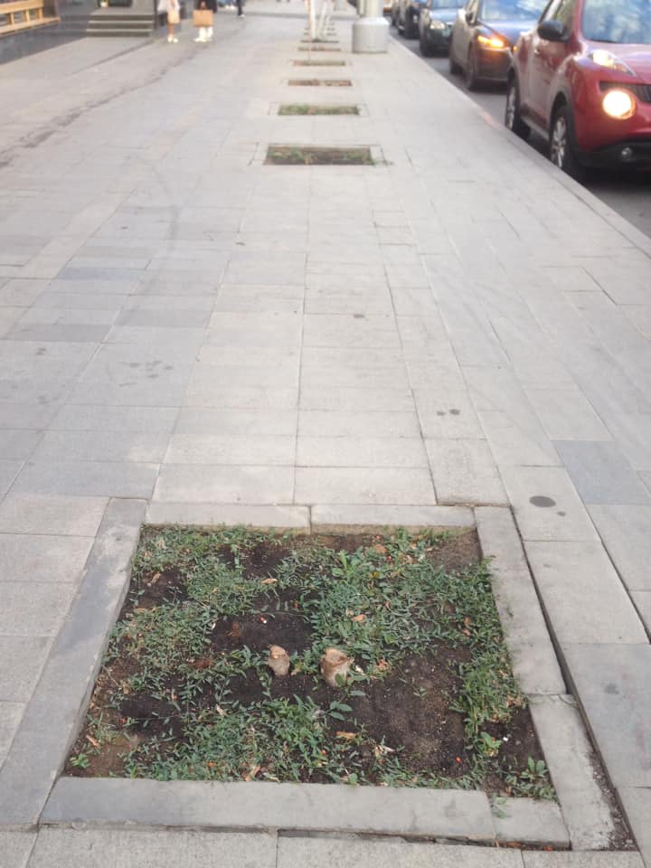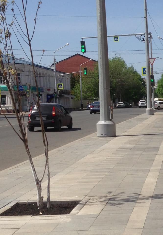 Первое фото сделано 15 мая, второе — в конце августа. На месте хилого майского саженца — свежий спил. Похоже, не выжило деревце в жару без полива. И таких — целый ряд. А весной все повторится сначала. Сдаётся, что такие «сезонные» посадки — чей-то очень хороший гешефт.