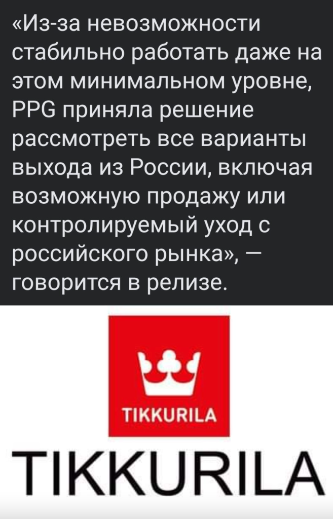 И Тиккурила уходит. Грунтовка и краски по дереву у них лучшие были (из доступных по цене). Их уход означает, что остальное подорожает. Кстати, некоторые краски наших производителей очень нехороши. Я брала на пробу (мы же постоянно что-то красим). Непонятно, зачем делать плохой продукт вообще.