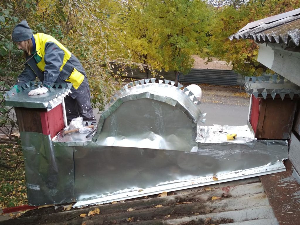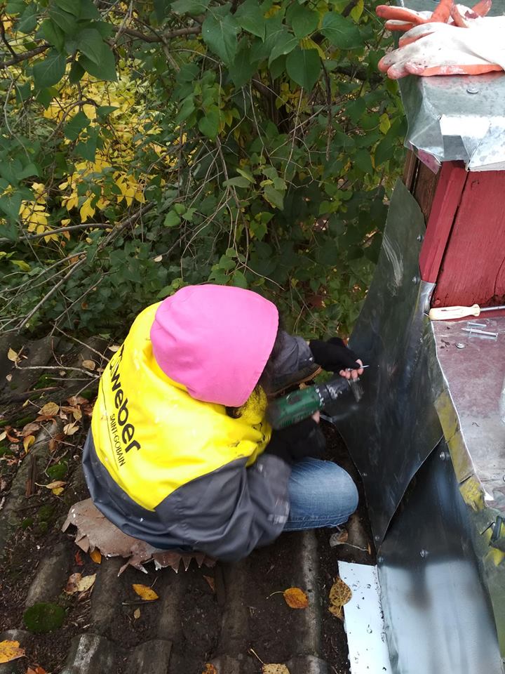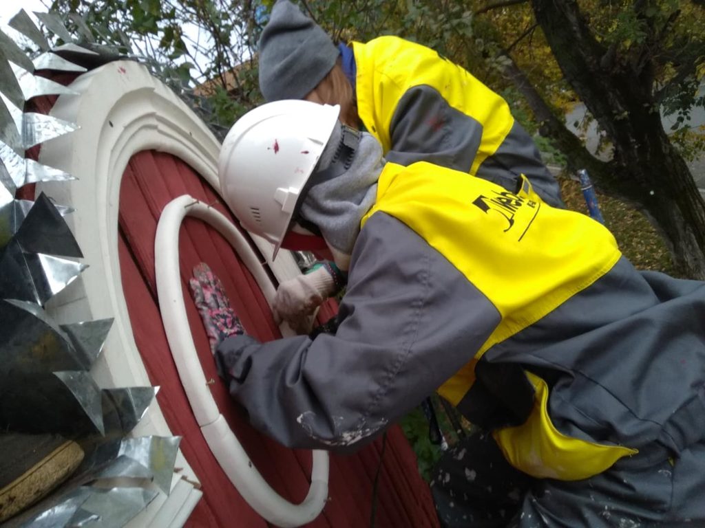Сегодня работали втроём на крыше над входной аркой. А четвёртый (йог Рафаэль) устанавливал внизу наличники на окна. Спрашиваю у организаторки Маши Тарасенко, что она, наверное, дико устала от всего этого…. Говорит «нет» и улыбается. Ага. Хорошо быть волонтеркой, хочу иду, не хочу — не иду, и поэтому поражаюсь колоссальной мотивации Маши и ужасаюсь, что человек больше 4х месяцев привязан к дому на Гоголя, 24 без права соскочить и с обязательностью приходить и работать, даже если никто из волонтёров не придет. Я бы на её месте, наверное, давно выгорела и лежала с неврозом. К счастью, у Маша в темпераменте, кажется, превалирует сангвиник, поэтому и волонтерить под её началом комфортно.